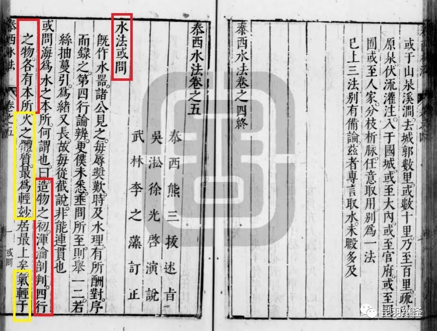 《泰西水法》卷五“水法或问”。“水法或问”的核心是“四元行论”。