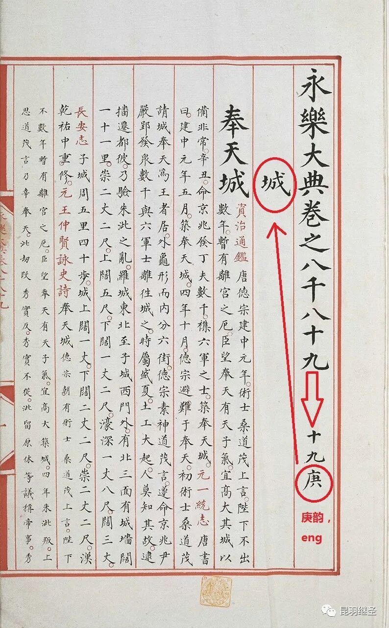 如,庚字韵(母)为“eng”,该卷为与韵(母)“eng”相关的“城”字,以庚韵来统“城”字,以“城”字来系事,再解释“城”的读音、意义,及相关词条。