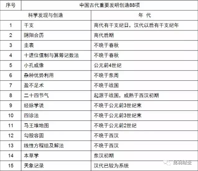 2016年,中国科学院自然史研究所集合全国超过100名科学家、科技史专家组成研究小组,历时三年研究宣布,古代中国人实现了包括天象记录、小孔成像、经脉学说、针灸、潮汐表、马镫、水稻栽培、地动仪等在内的多达88项具有全球性意义的科学突破和技术成就,并将其作为重大成就出版,名为《中国古代重要科技发明创造》。