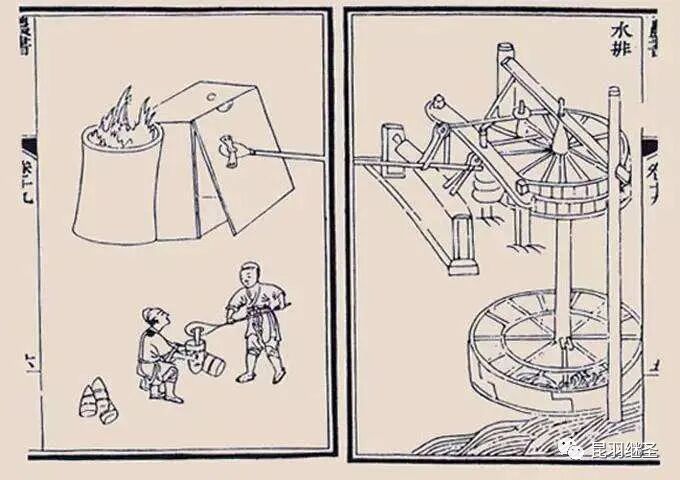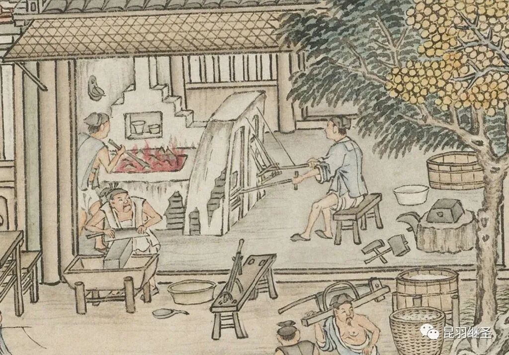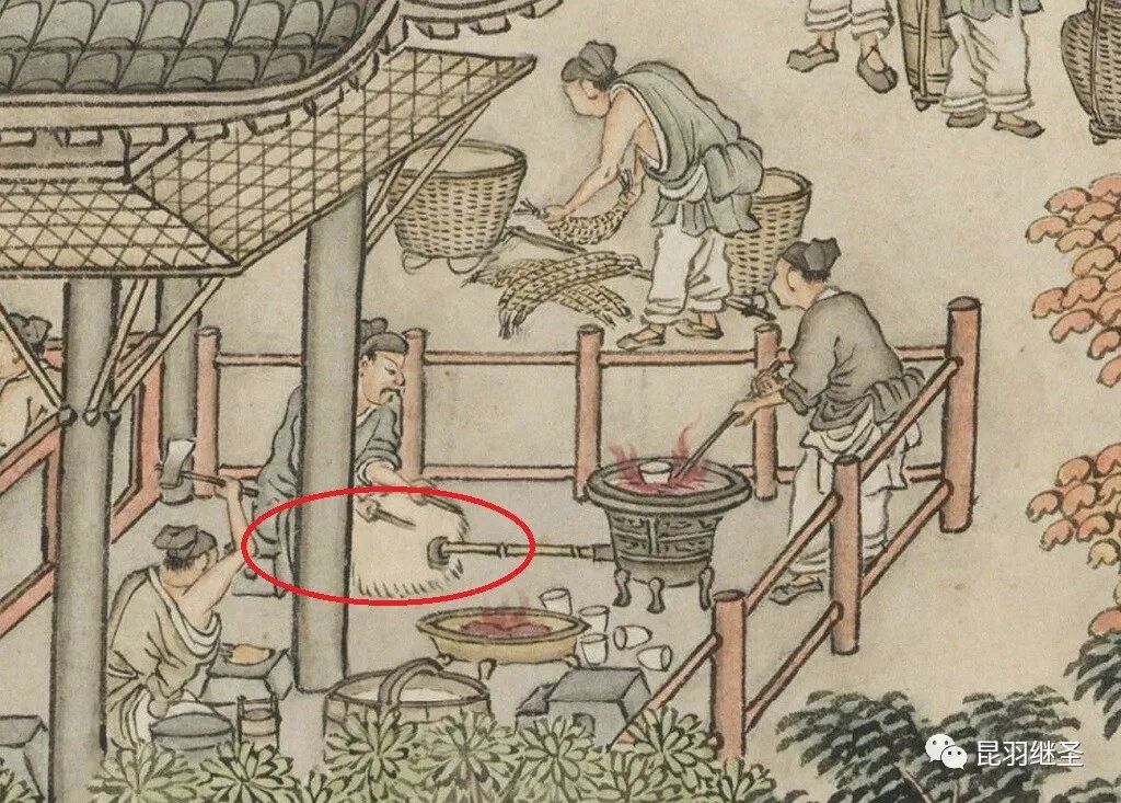 《仿宋院本金陵图卷》中有一个冶炼鼓风的器具,名曰“ 鞲(gōu)鞴( bài)”,上图放大后查看如下: