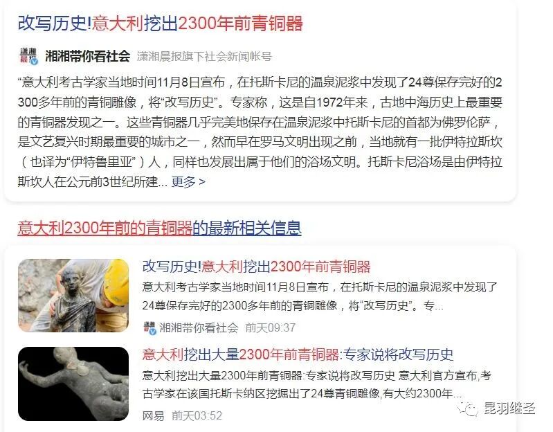 此外,意大利挖出来的青铜器所呈现的人物神态、面貌、服饰等等,居然与现代人像雕塑差不多。难道,2300多年前的社会与现代社会一样?衣饰、发型、生活习俗都与现在一样?