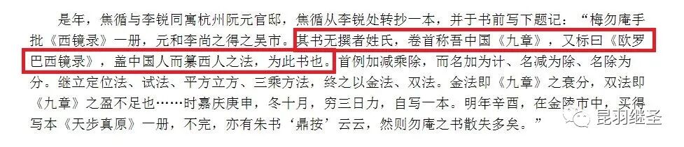 清人焦循在该书的题记中说得够清楚了吗?——卷首称吾中国《九章》,又标曰《欧罗巴西镜录》,盖中国人而纂西人之法,为此书也!