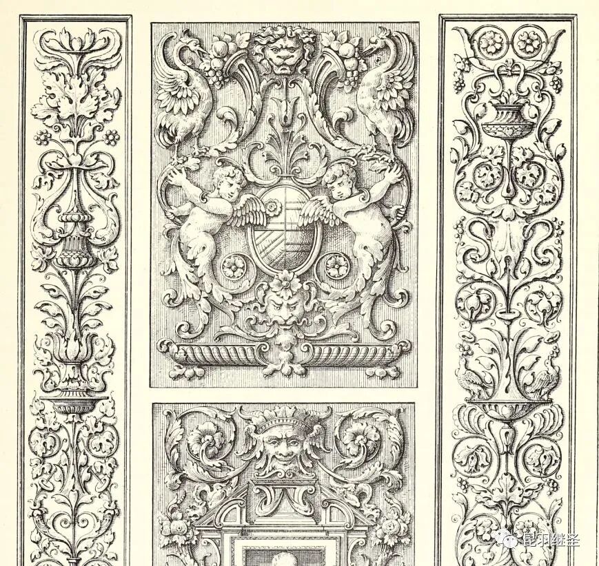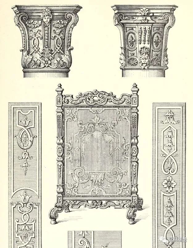 Robert Brook一书《木制家具风格元素》(1889年版)中的纹样,如下。你卷我也卷,大家一起卷,看谁卷得更好看。