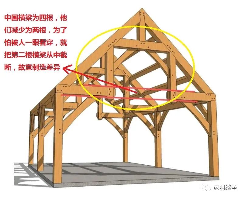 后来,英国也学了去,只不过稍微作了些改动,将四椽栿从中间断开,故意弄成一种悬臂梁的结构,以免被人一眼看穿。其实,这就是华夏的四架椽抬梁式,节点部分采用了穿斗结构,仅此而已。