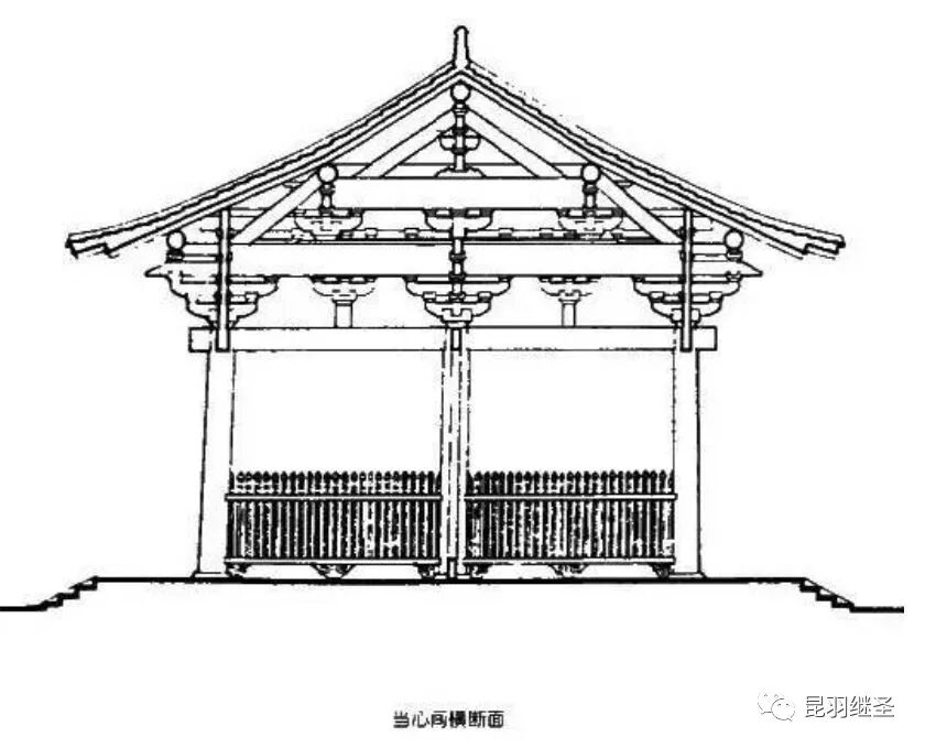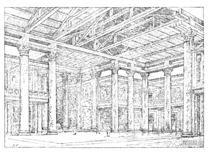书中所绘这幅图的内部结构完全抄袭华夏建筑的分心槽、抬梁式构架和天花。