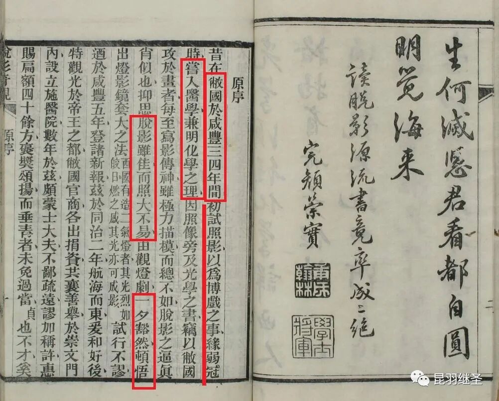 “……攻于化学者,调剂配搭变化,草木金石,血气等类,触类引伸,而体用兼备,由是而精焉。太西照影盛兴始自道光十九年(1839年),即今三十余载……”