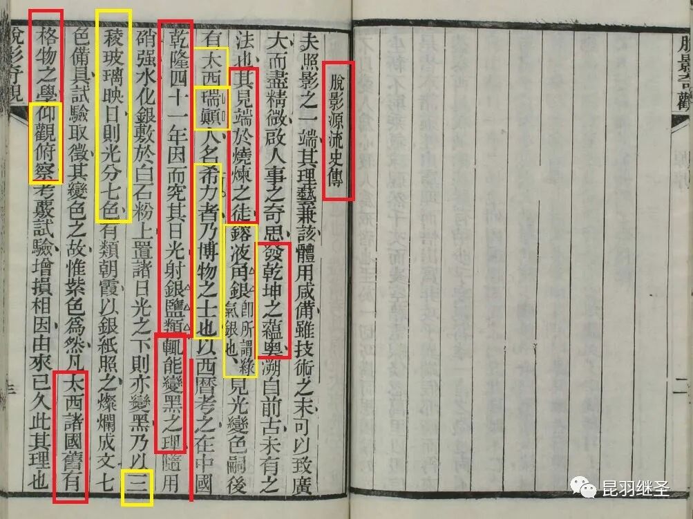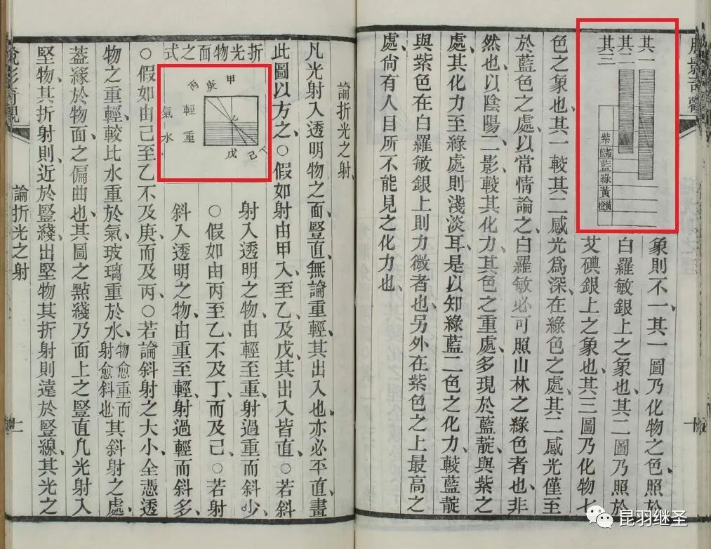 “……发乾坤之蕴奥,溯自前古未有之法也。其见端于烧炼之徒,熔液角银(即所谓绿气银也),见光变色,伺后有太西瑞颠人名希力者,乃博物之士也,以西历考之,在中国乾隆四十一年(1776年),因而究其日光射银盐类,则能变黑之理,随用硝强水化银敷于白石粉上,置诸日光之下,则亦变黑,乃以三棱玻璃映日,则光分七色,有类朝霞……太西诸国旧有格物之学,仰观俯察……”