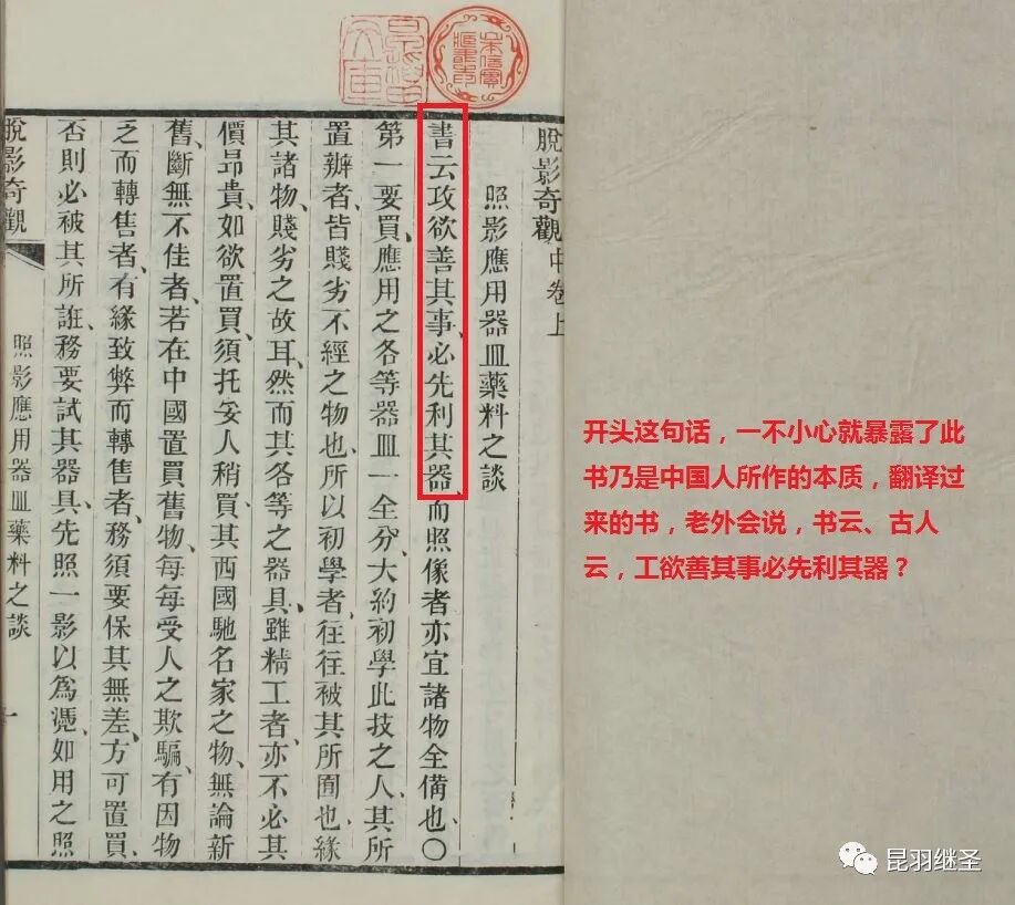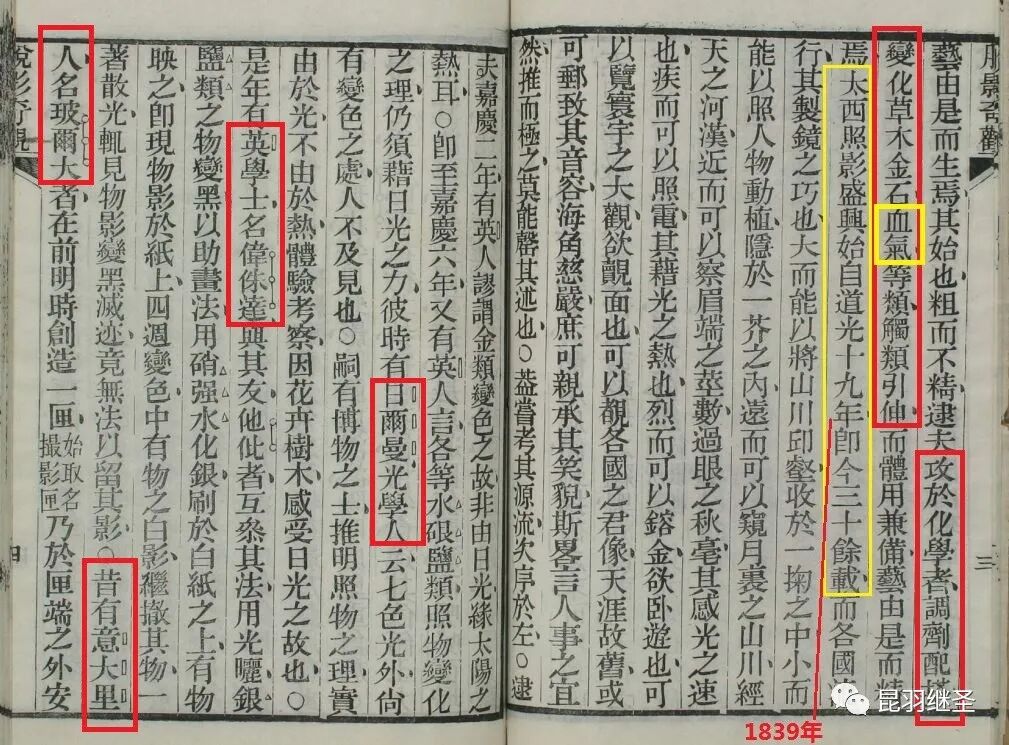 注意,书中提到了照影术(摄影术),但是并未提到什么法国人达盖尔,这么重要的发明居然不提西方发明者的大名,后面都有提什么名不见经传的英国人伟侏达、意大利人波尔大,怎么就偏偏不提达盖尔呢?