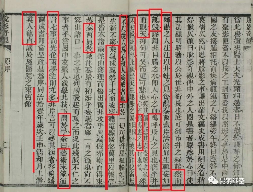 “……然而,乡愚之人,往往以井蛙之见,每观泰西画片活泼如生,则妄加诋毁……呜呼,斯人之见也,犹坐井而观天。……笑其偏见,悲其以盗蹠之私心而测夷惠之志行也哉。殊不知欧洲列邦凡钦崇天主耶教之国……被其神化者,无不以爱人为心,杀人为戒者也。至于一切巧构奇思、机轮妙器,生新不穷,乘气球飘然千丈而凌空,借电线倏忽万里以报信……泰西真教……问于予,余曰:艺术末流通计七事,而光(学)化(学)两学法则尤多,非片言可以尽其术者,容……翻译成书,即当呈政是为序。同治拾壹年,岁次壬申,清和月,上瀚英人德贞识于施医院之来宾馆。”