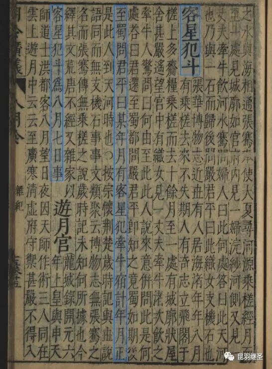 “客星犯斗……至蜀,问君平,曰:某年某月,有客星犯牵牛宿。计其年月,正是此人到天河时也……客星犯斗为八月七日事……”