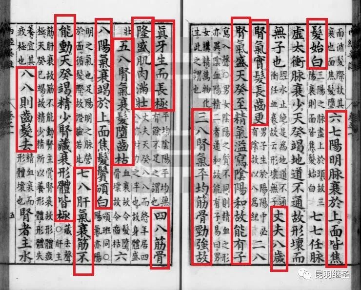 丈夫八岁,肾气实,发长齿更,二八,肾气盛,天癸至,精气溢泻,阴阳和,故能有子,三八,肾气平均,筋骨劲强,故真牙生而长极,四八,筋骨隆盛,肌肉满壮,五八,肾气衰,发堕齿槁。六八,阳气衰竭于上,面焦,发鬓颁白,七八,肝气衰,筋不能动,八八,天癸竭,精少,肾脏衰,形体皆极,则齿发去。肾者主水,受五脏六腑之精而藏之,故五脏盛乃能泻。今五脏皆衰,筋骨解堕,天癸尽矣。故发鬓白,身体重,行步不正,而无子耳。”