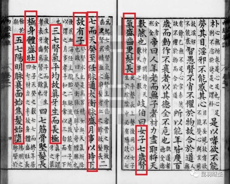 岐伯曰:女子七岁,肾气盛,齿更发长,二七而天癸至,任脉通,太冲脉盛,月事以时下,故有子,三七,肾气平均、故真牙生而长极,四七,筋骨坚,发长极,身体盛壮,五七阳明脉衰,面始焦,发始堕,六七,三阳脉衰于上,面皆焦,发始白,七七,任脉虚,太冲脉衰少,天奚竭,地道不通,故形坏而无子也。