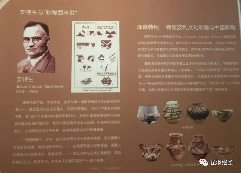安特生在河南仰韶村发现了大量彩陶,认为这些彩陶最初源自欧洲的乌克兰特里波耶文明遗址(Trypillianculture,号称距今已有七千多年),后一路东传,经中亚土库曼斯坦的安诺遗址,再进入甘肃,而后一路传至河南。