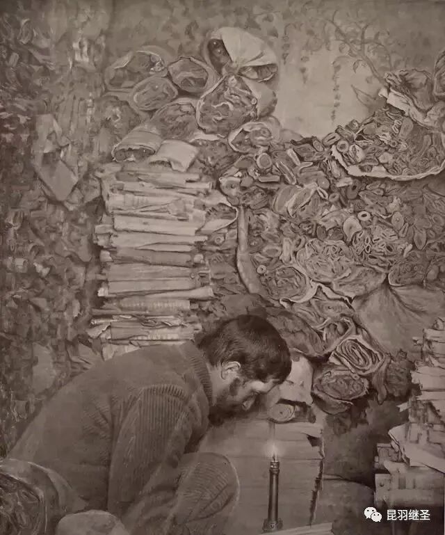 春,斯坦因来到敦煌莫高窟,用500两银子买通王圆箓,劫走写本文书24箱,绘、绣的佛画5箱。