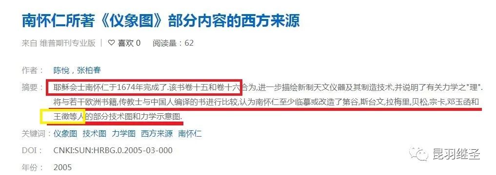 再看另一篇研究论文,该论文发现《仪象图》中所绘制的天文仪器、制造技术说明了有关力学之理(也就是说,制造这些仪器要涉及物理学中的力学,不是随随便便想造就能造的),将之与若干所谓的欧洲书籍(传教士编译的所谓版本)进行比较,得出结论,认为南怀仁至少临摹(抄袭)或改造了第谷、斯台文、拉梅里、贝松、宗卡、邓玉函和王徴等人的部分技术图和力学示意图。