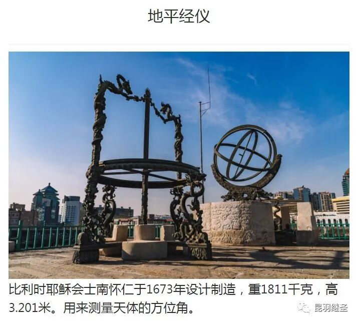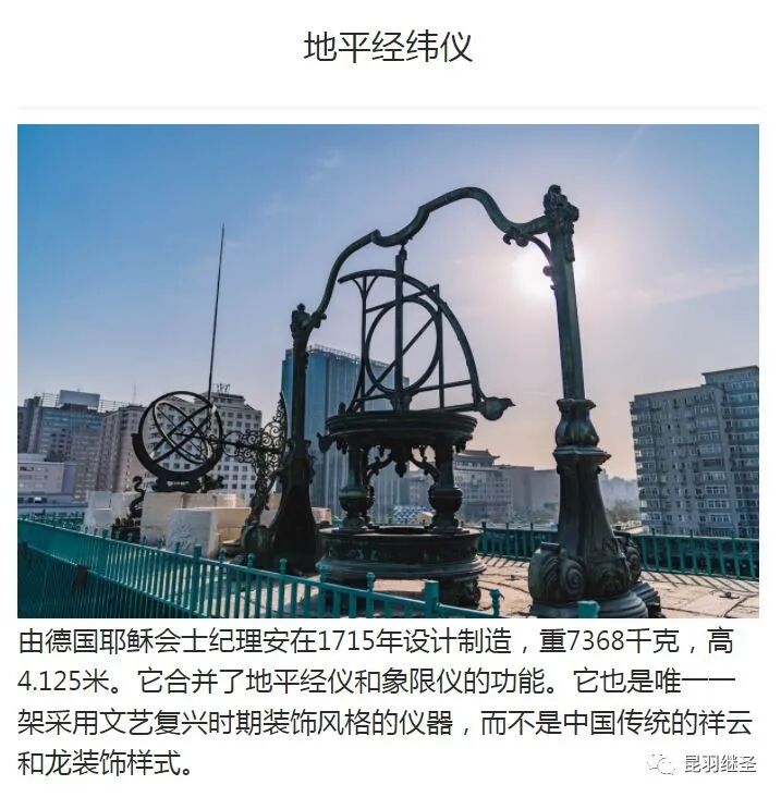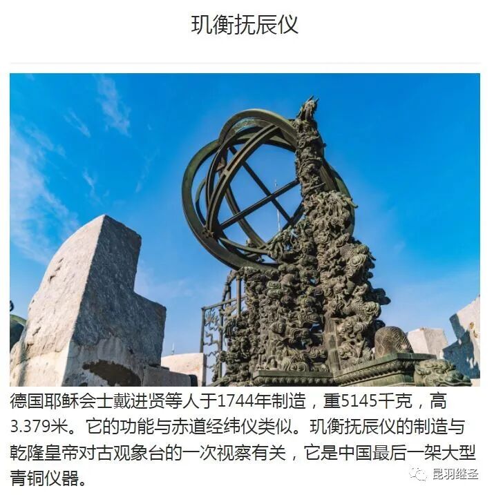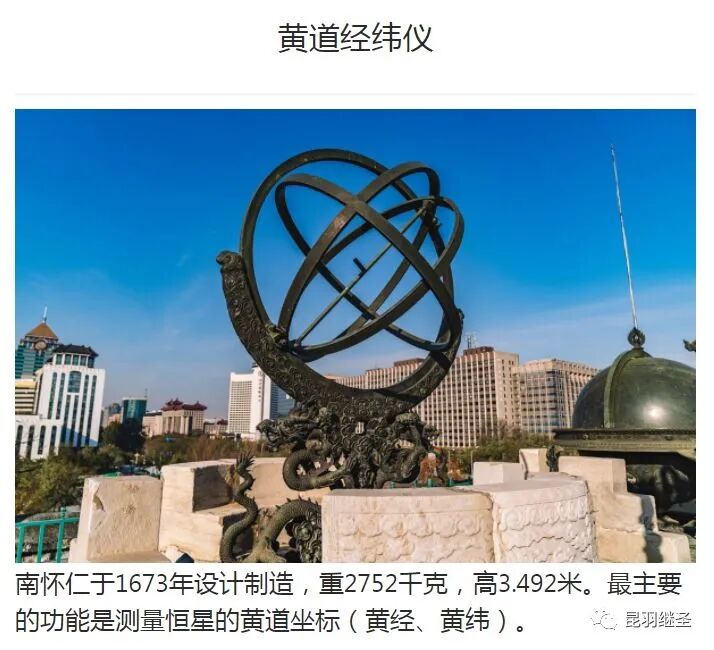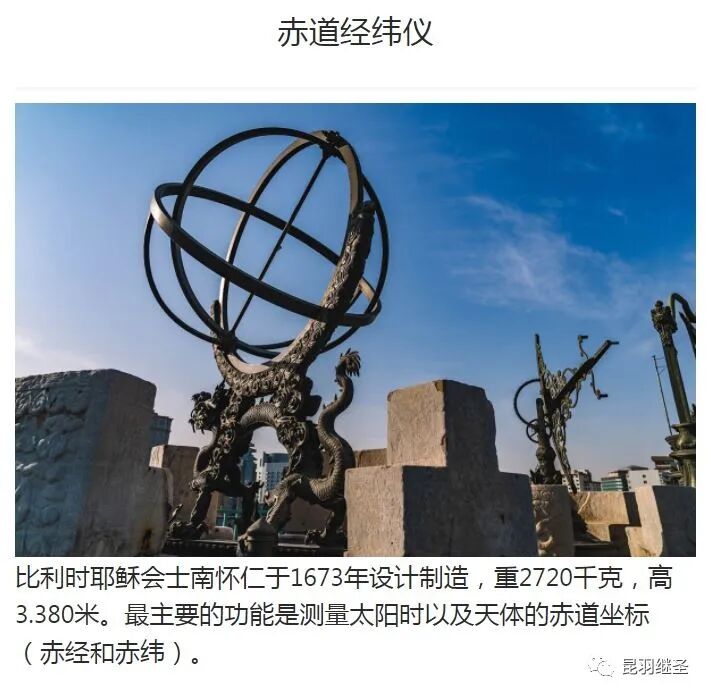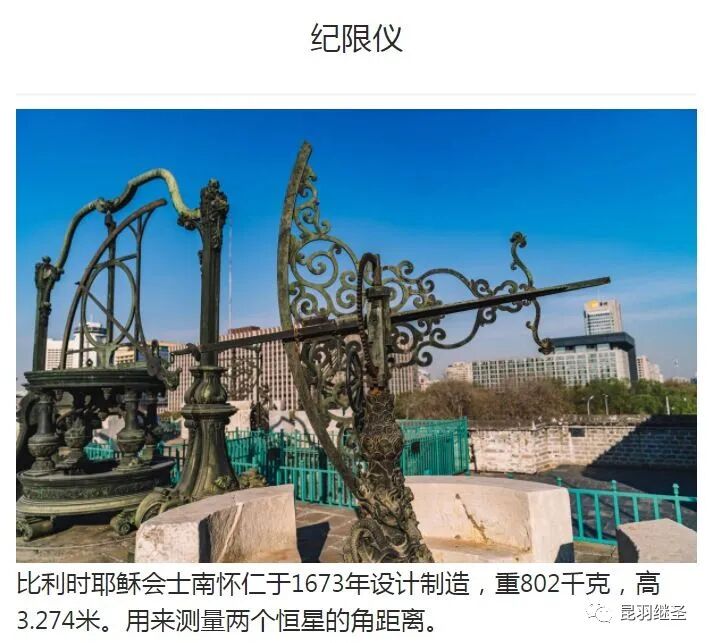 笔者专门查阅了一下北京古观象台的有关资料,如下所示,相关仪器可与上面提及的《新制灵台仪象志》中的六种天文观测仪器比较。