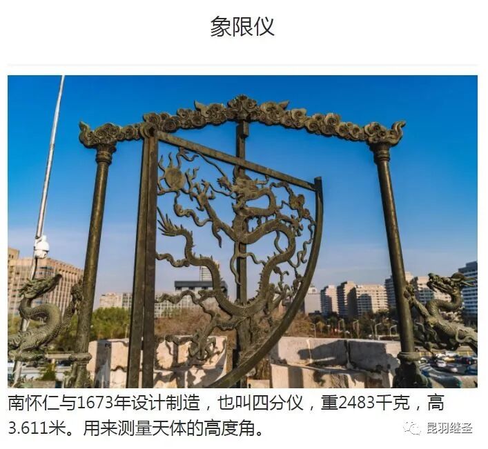如今,这些观测仪器仍旧摆放在北京建国门古观象台上,供人游览参观。