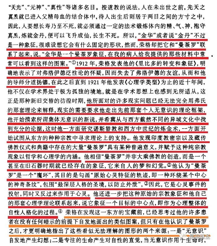 “我要强调的是,《太乙金华宗旨》使我第一次步入了正确的轨道。在中世纪的炼丹术中,我找到了诺斯替和集体无意识之间的关联性,并可以在当代人的心理观察中得到印证。”(详见:荣格《太乙金华宗旨》德文本第二版序言)