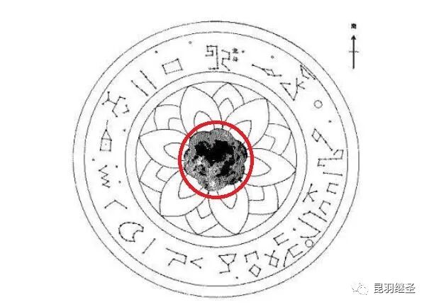 该星象图呈圆形,外圆和内圆之间绘制有太阳、月亮和其他主要恒星,二十八星宿按照投影法排列。内圆为十二瓣莲花图案,莲花图案的花芯是一幅六瓣牡丹花图案。在牡丹花图案的中心,镶嵌着一根铁棍。