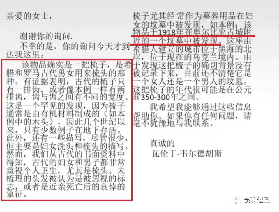 因为有一个奇怪的现象,就是国外考古经常出现“梳子”。如下例所示,西人据此考定西方古人很重视个人卫生,尤其是梳头,还将两排齿的梳子说成是古希腊、古罗马男女用来梳头的那种,——再仔细一瞧,该物品居然是1918年在奥尔比亚古城附近的一处坟墓中发现的。