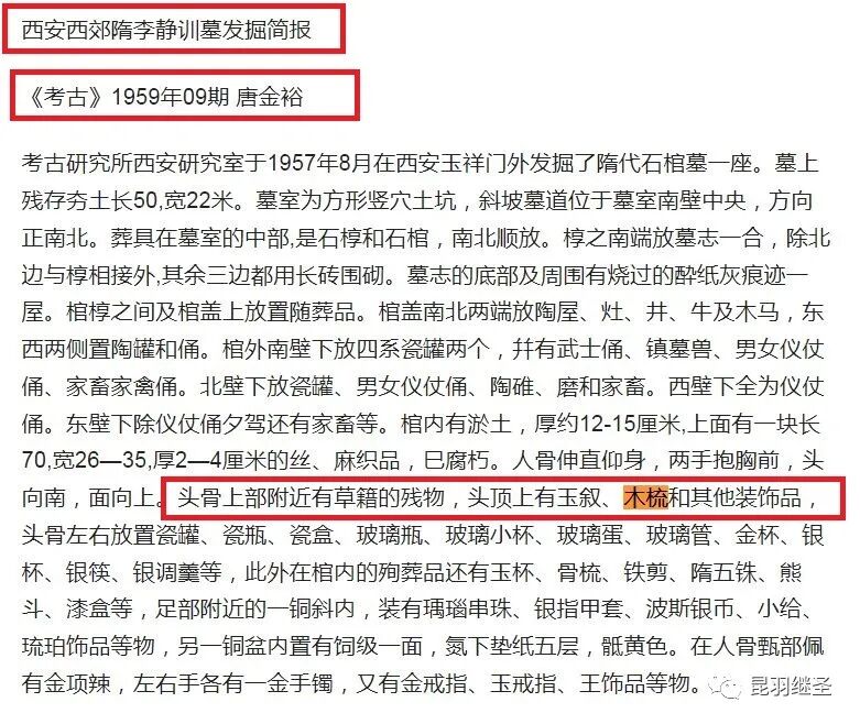 《西安西郊隋李静训墓发掘简报》刊登的《考古》(1959年09期 唐金裕)中提到,墓主人头部位置亦发现有一枚木梳。