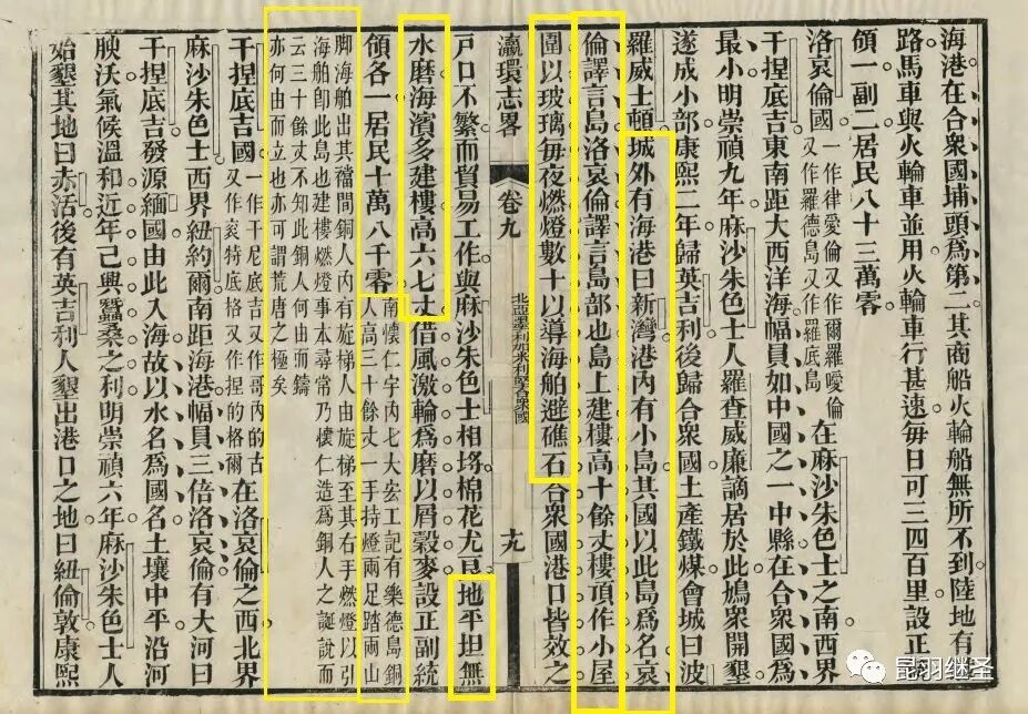 “会城波罗威士顿(今日或译博洛维斯顿)城外有海港,曰新湾。港内有小岛,其国以此岛为名哀伦(艾伦),译言岛。洛哀伦,译言岛部也。岛上建楼高十余丈,楼顶作小屋,围以玻璃,每夜燃灯数十,以导海舶避礁石,合众国港口皆效之。……地平坦,无水磨,海滨多建楼,高六七丈……”