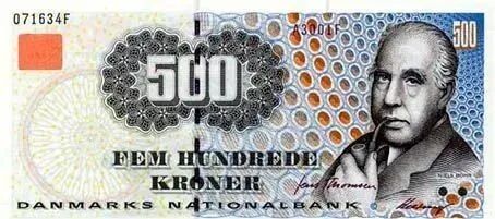 这是一张1997年版的500丹麦克朗的纸币。纸币正面右侧,有一位手拿烟嘴的著名人物,他就是原子物理学之父,尼尔斯·亨利克·戴维·玻尔(丹麦文:Niels Henrik David Bohr,1885年10月7日-1962年11月18日)。