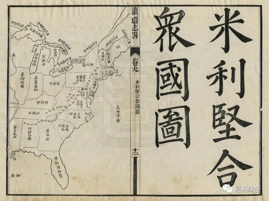 “合众国皆在东境。华盛顿初建国时,止(只)十余国,后附近诸国陆续归附,又有分析者,共成二十六国。西境未辟之地,皆土番。凡辟新土,先以猎夫杀其熊鹿野牛、无业之民,任其开垦荒地,生聚至四万人,则建立城邑,称为一部,附于合众国之后。今合众国之外,已益三部,总统领所居华盛顿都城,不在诸国诸部数内。计国二十六、部三。其丁口至道光二十年(1840年),计一千七百一十六万九千余。”