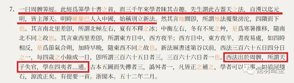 “一曰周髀算经。此经为算学十书之首,而三千年来学者昧其旨趣,先生谓此古盖天之法,自汉以迄元明,皆主浑天。明时,欧罗巴人入中国,始称别立新法。……西法出于周髀,所谓天子失官,学在四夷者……”