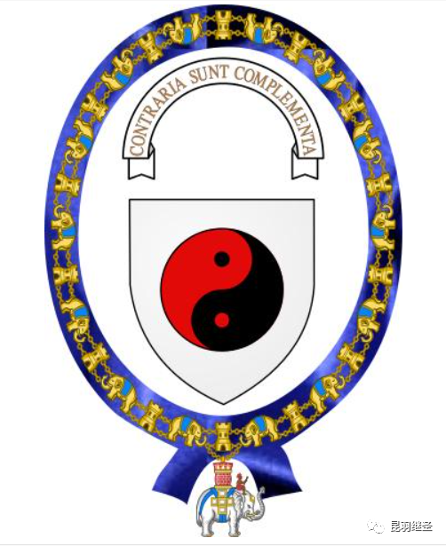 因为玻尔在科学上的杰出成就及贡献,丹麦国王于1947年封他为“骑象勋爵”,并授予其荣誉徽章。按照往常惯例,爵士徽章上应镌刻授奖人的族徽,于是玻尔亲自设计了自己的族徽,并采用了太极图的元素,还在族徽上方刻下一句拉丁文箴言:Contraria Sunt Complementa(对立即互补)。