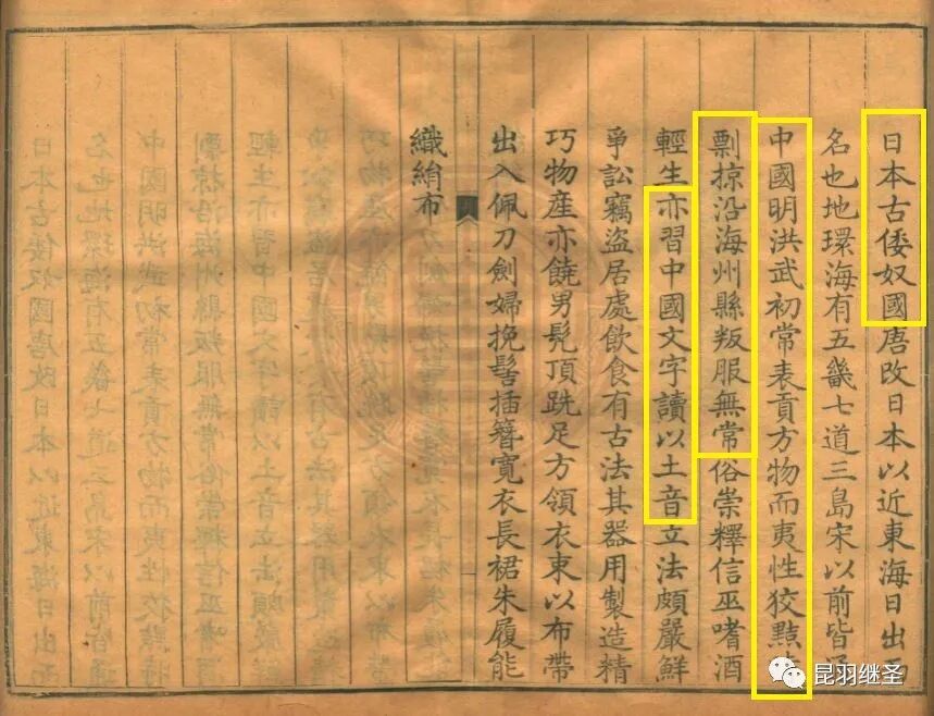日本,古倭奴国。唐时改日本,以近东海日出而为名也。地环海有五畿七道三岛,宋以前皆通。中国明洪武初,常表贡方物而夷性狡黠,时剽掠沿海州县,判服无常。俗崇释信巫,嗜酒轻生,亦习中国文字,读以土音……