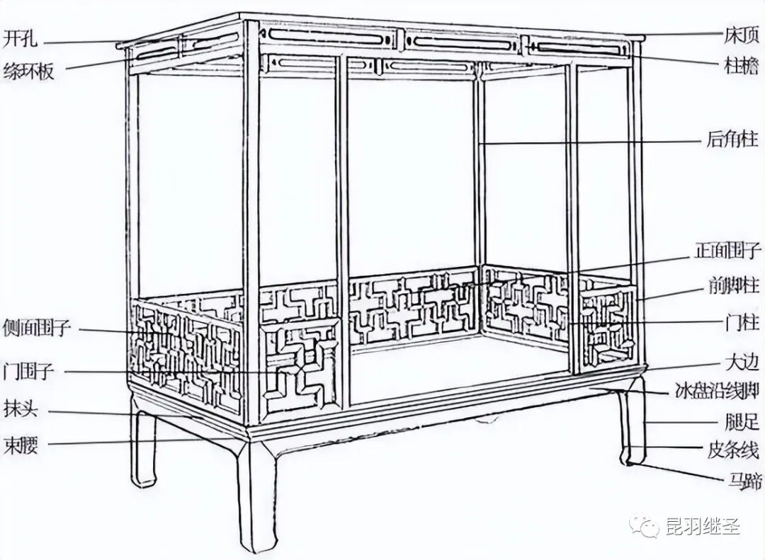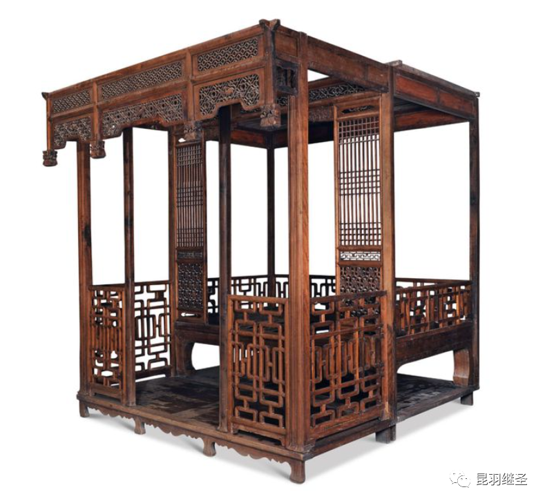 四柱架子床:这是架子床最基本的样式,三面设有矮围子,四角立柱,上承床顶,顶下围有挂檐。南方工匠因其有四根柱子,有称“四柱床”。