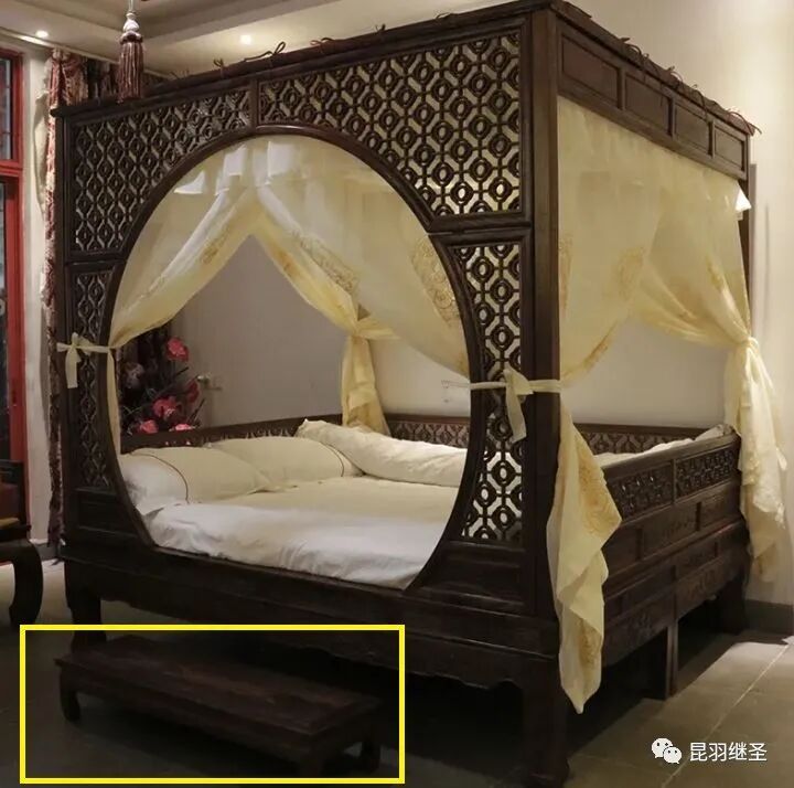 中式月洞架子床(如下)。哟,原来,东西方的床前,都放脚踏呀。又想到一块儿去了?