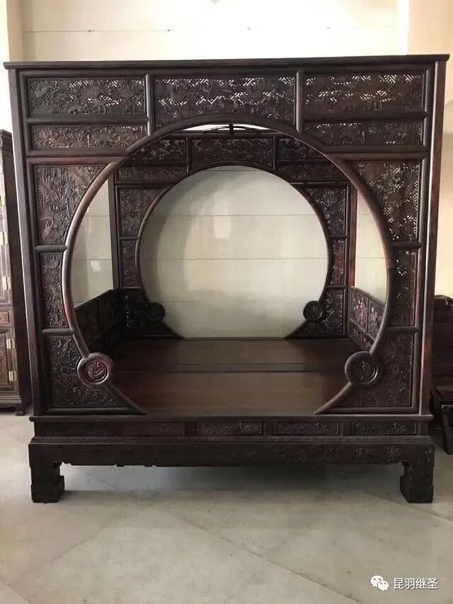 月洞式架子床:亦称“月亮门”式架子床(北京一带的称呼),其制作更为复杂,在正面床沿安上“月满式“门罩,四面围子与挂檐上下连成一体,形成一个方形的完整花罩,即“满罩式”架子床。