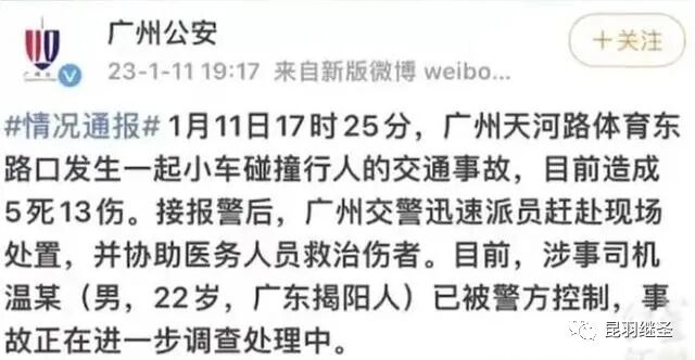 1月11日17时25分,广州天河路体育东路口、正佳广场附近发生一起黑色宝马车肇事冲撞行人致5死13伤的重大交通事故。