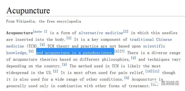 尽管针灸在180多个国家不断得到认可,但维基百科依然坚持己见,认为针灸属于伪科学,其在针灸英文页面上赫然注明: