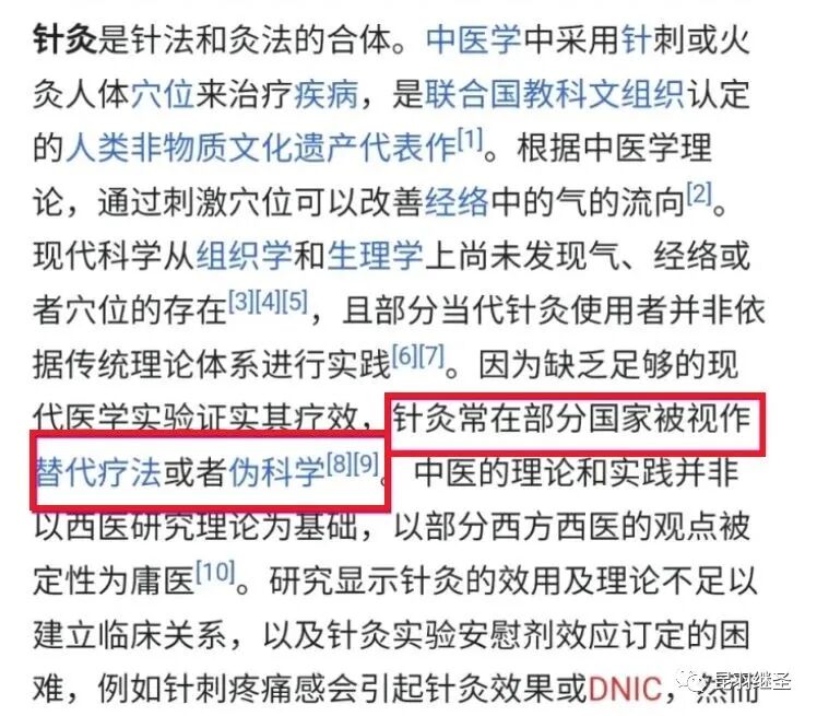 维基百科不但声称“针灸是一种伪科学”,甚至还否定了整个中医体系,指责“中医理论和实践不是基于科学知识基础。”