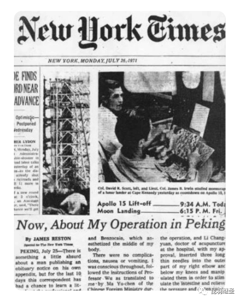 当年7月26日,《纽约时报》头版发表了赖斯顿的文章《现在,让我告诉你们我在北京的手术》(Now, About My Operation in Peking),讲述了这段难忘的经历与针灸的神奇疗效。注意,这被很多人视为针灸传入花旗国的历史性标志。