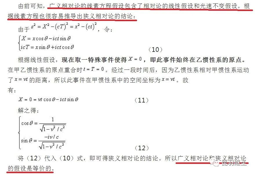 根据线素方程可以很容易推导出狭义相对论的结论。所以,广义相对论和狭义相对论的假设是等价的,且看程碧波教授的分析: