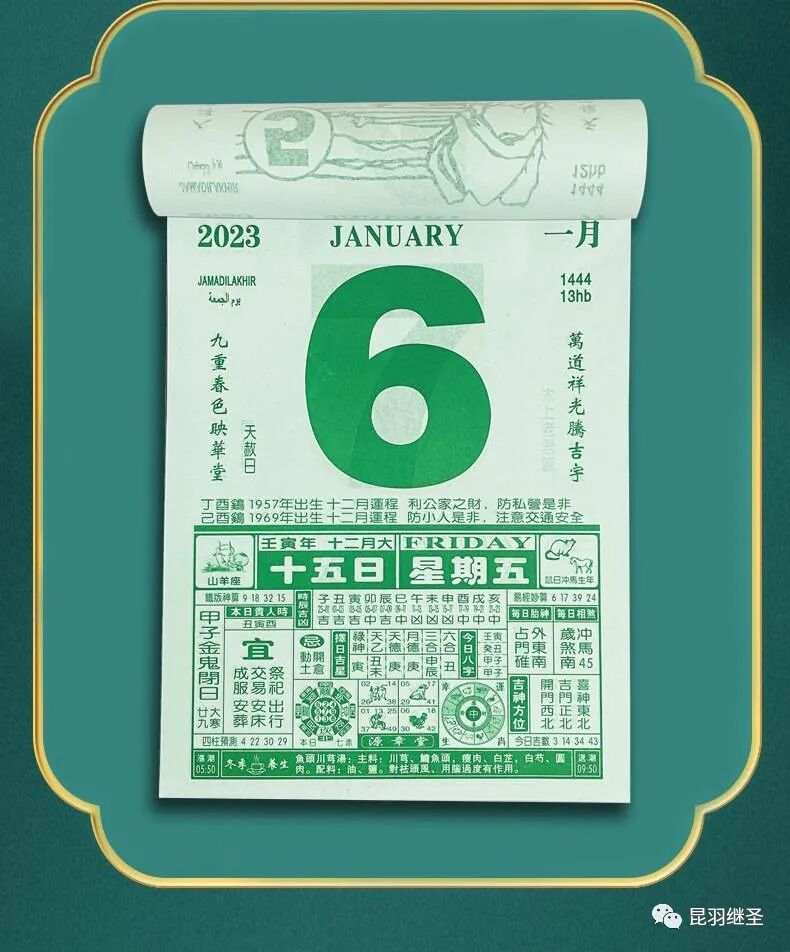 老黄历还有另一种形式,名曰流年运势,例如,“2023流年运势”“卯年流年运势”等等。为了彰显可靠、行销方便,往往会在名称前冠以“香港某某名家”的头衔。这种黄历附带内容也很多,包括药方、器物保养、养殖、巫术、武术、占卜(蓍草、铜钱、圣杯)、六十甲子生肖图、八字五柱、命理改名、紫微斗数、称骨等等,不一而足。