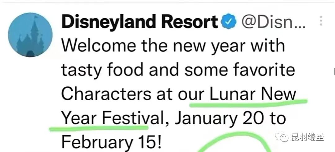 迪斯尼也出来了,把Chinese New Year(英文简称CNY,中国春节),故意说成Lunar New Year Festival(农历春节)。