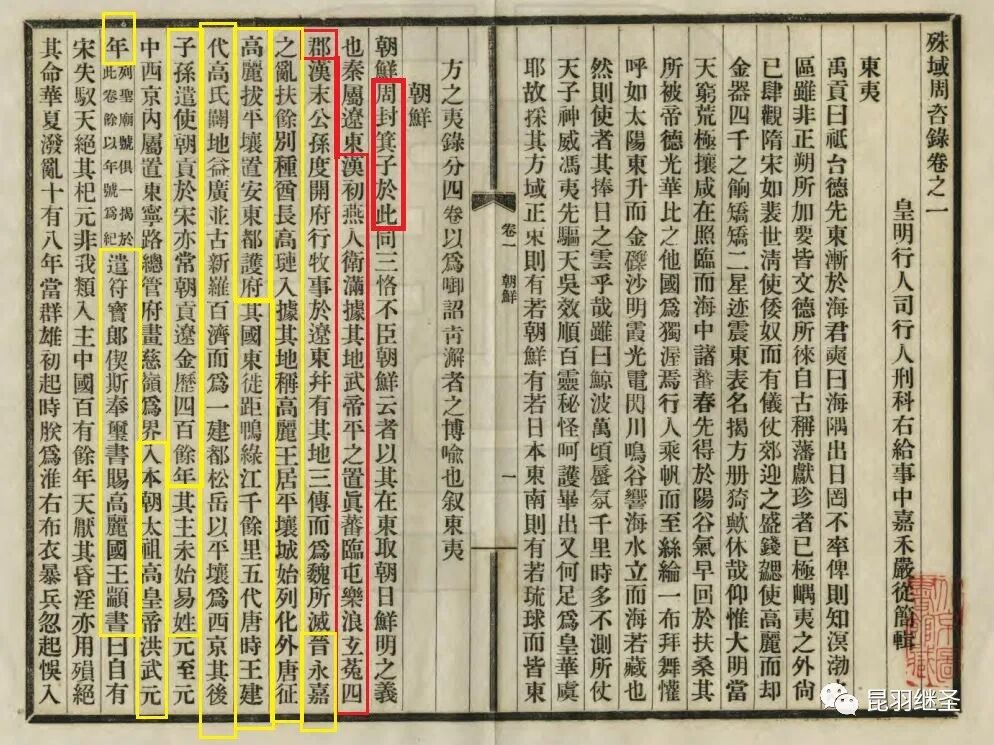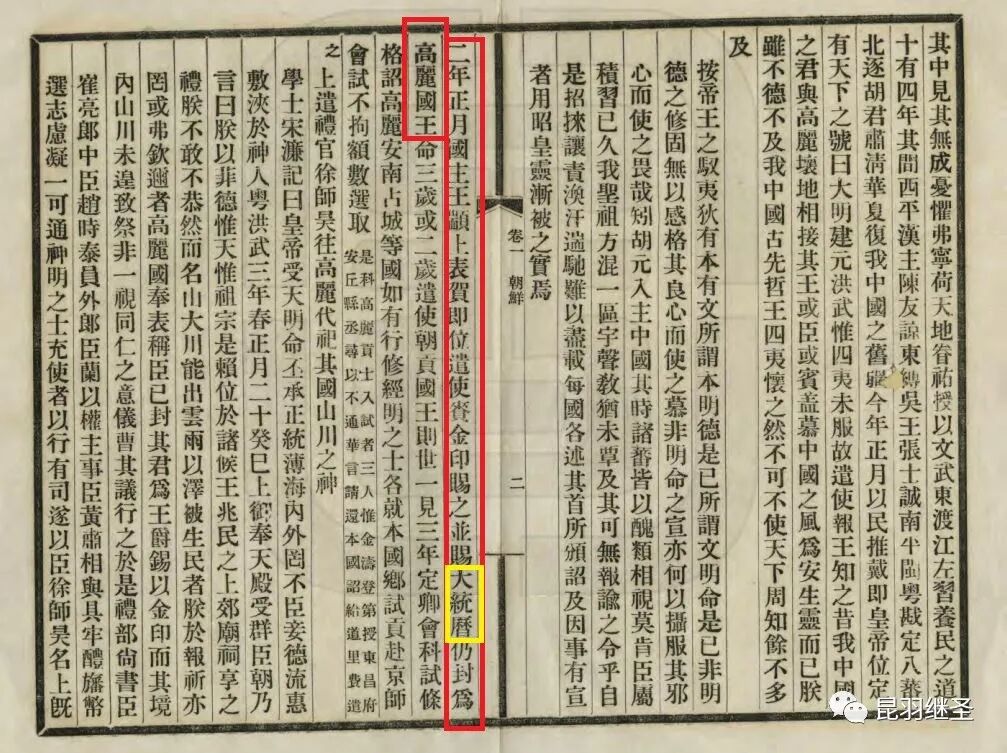 “本朝洪武廿五年,高丽国王王瑶昏迷多杀,失众心,国人乃共推门下侍郎李成桂权知国事。遣其国知密直司事赵胖来请命。后成桂更名旦,且以易国号上请。上曰「东夷之号惟‘朝鲜’最美且久」,诏改曰朝鲜。既得命,遂迁都今汉城府,以此为留都云。”