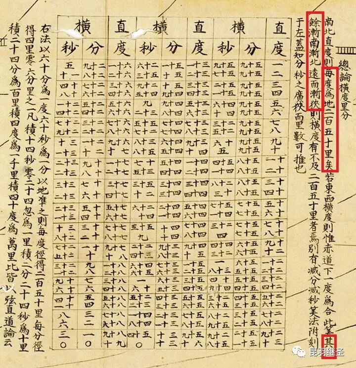 此外,《坤舆万国全图》右下方有一个表、左侧有一个说明,使用的长度单位是“华里”,而西方没有“华里”的概念。表上的“径”便是路途、长度之意(不是“直径”,“直径”没有细分单位度、分、秒的),每度为250华里,360度就是9万华里,换算过来当时测得的地球周长便是4.5万公里,与今日所测结果40075公里只差大约10%左右。