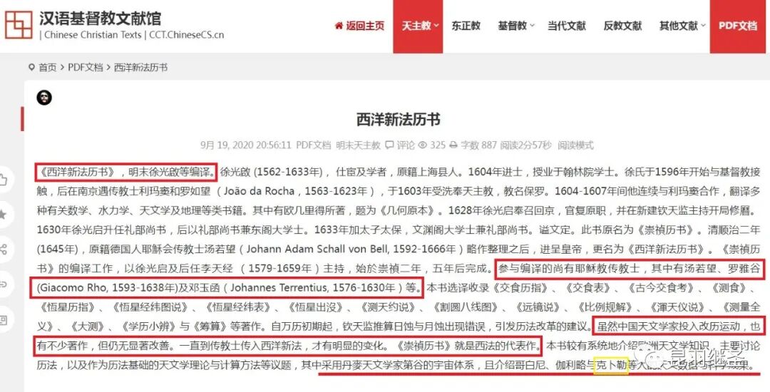 来,咱们一起看看汉语基督教文献馆有关《西洋新法历书》的说法: