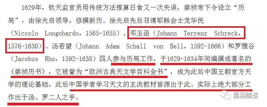 即便如此,某些学者仍旧人云亦云,跟着西洋人说邓玉函参与了历局工作。还把《崇祯历书》誉为“欧洲古典天文学百科全书”,并把功劳都归到了传教士汤若望、罗雅谷的头上,认为绝大部分工作出自于这二人之手。