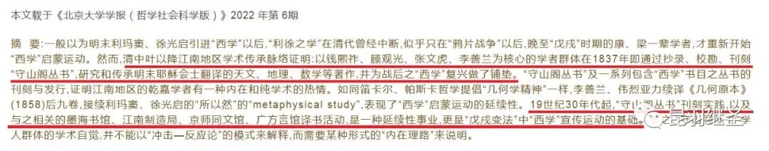 “清中叶以降江南地区学术传承脉络证明:以钱熙祚、顾观光、张文虎、李善兰为核心的学者群体在1837年即通过抄录、校勘、刊刻‘守山阁丛书’,研究和传承明末耶稣会士翻译的天文、地理、数学等著作,并为战后之‘西学’复兴做了铺垫。