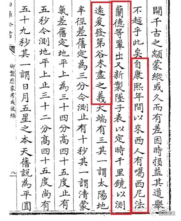 “自康熙中,西洋噶西尼、法兰德等出,又新制坠子表以定时,千里镜以测逺,以发第谷未尽之义。”