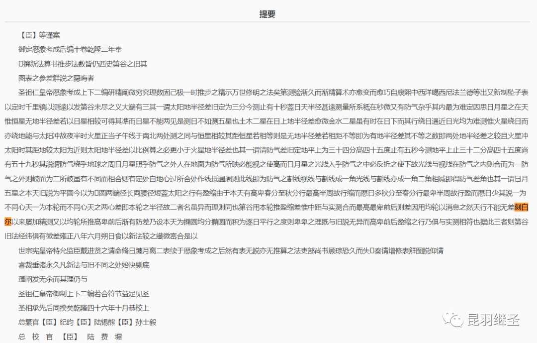 诡异的是,网上流传的乾隆四十六年(1781年)的奏疏中出现了刻白尔(开普勒)的名字。