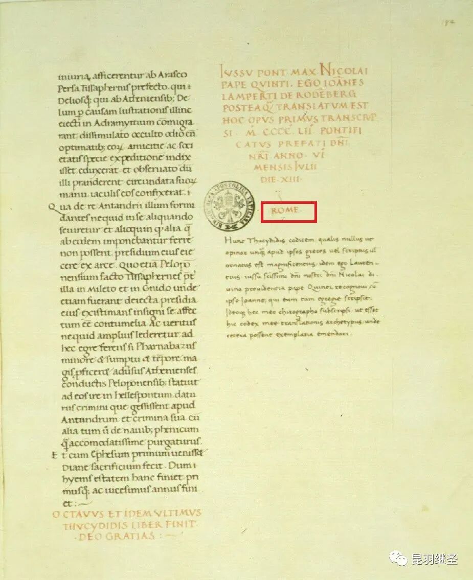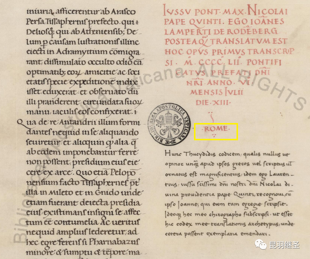 《伯罗奔尼撒战争史》是1452年在罗马伪造的,梵蒂冈保存着底本,如下所示,右下角的文字是教皇秘书洛伦佐·瓦拉的亲笔所书。