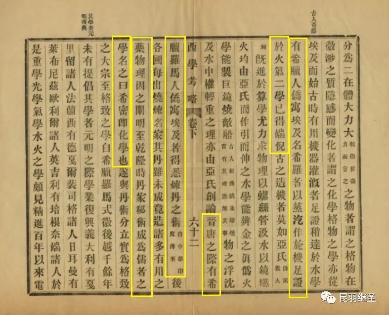 “……五大洲唯雅细亚(亚洲)开化最早。……中国之古术必因之以西传,厥后至秦汉之世,希腊及犹太之化传之罗马,复由罗马递传至欧洲,诸国至西国取法中华,其可恃而有据者试为缕指而臚(lú,陈述)陈之。一为修炼丹药各术,西人因而推出化学之理以广其用。”